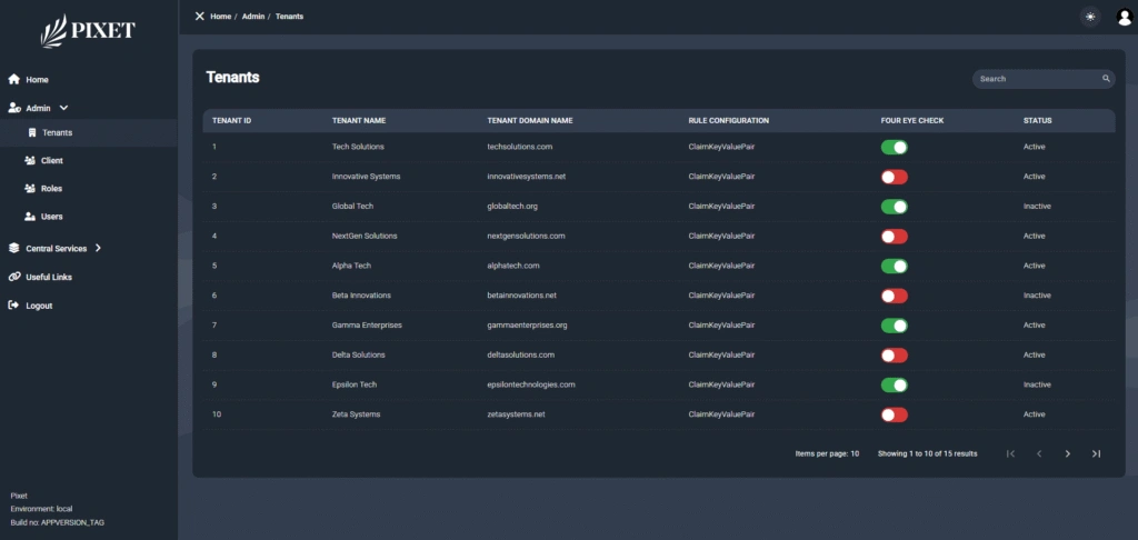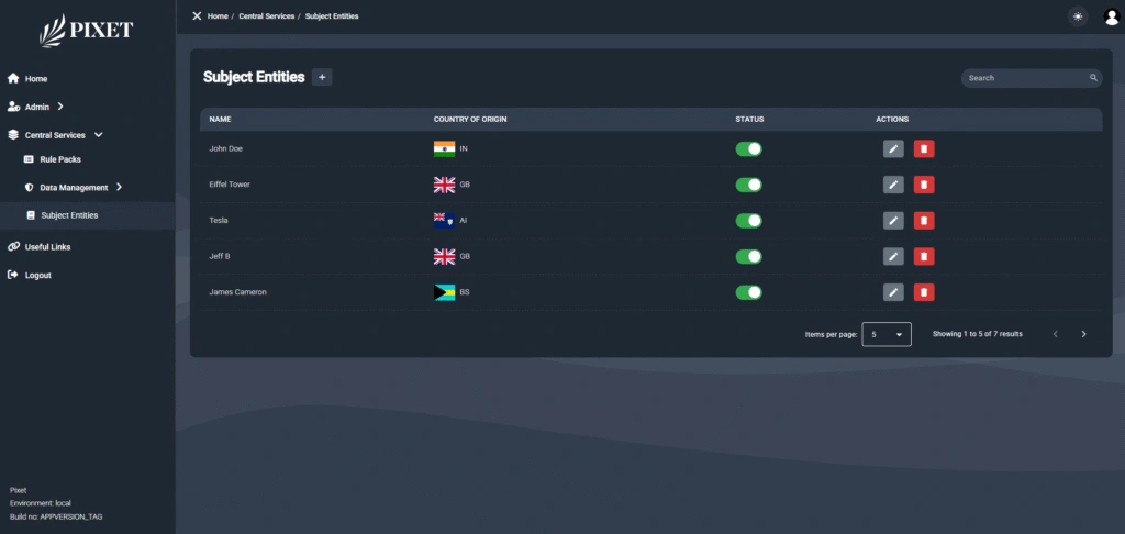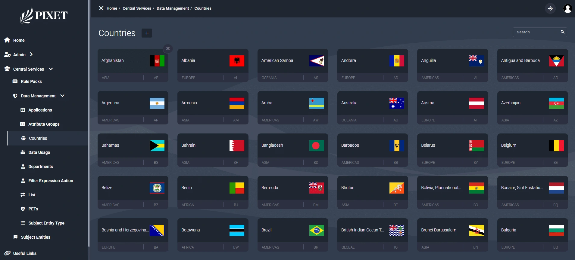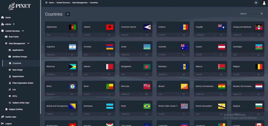 Pixet Security is a unified data management and administration platform for the facilitation of the processing of structured, entity-based information within several operational modules. The system is sleek and easy to use with a tidy, well-organized sidebar navigation that is intuitive and maximizes efficiency. The site has specific sections like Country Management, which has robust search and filter functionalities for users to efficiently find and administer related records. The navigation panel on the left is also segregated into key areas like Central Services and Data Management, demonstrating a modular structure that enables scalability and flexibility. With emphasis on security, usability, and data handling in a controlled manner, Pixet Security provides a perfect setting for organizations that want to centralize their administration without having to sacrifice control over data purity and access by users.
